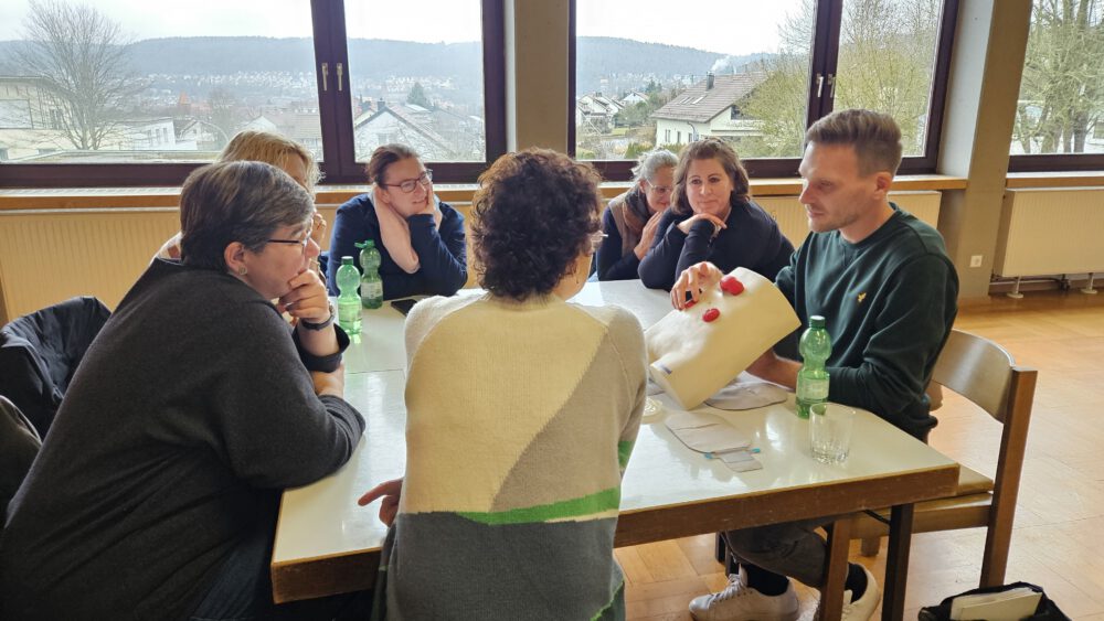 Am 9. Oktober 2025 durften wir 19 Praxisanleiterinnen und Praxisanleiter zu einer ganztägigen Fortbildung im Lembergemeindehaus begrüßen. Die Veranstaltung war Teil einer Fortbildungsreihe, die vor einigen Jahren in Kooperation mit der Diakoniestation Altensteig ins Leben gerufen wurde – mit dem Ziel, die Vernetzung unter den Ausbildungseinrichtungen zu fördern. Umso mehr freuten wir uns, dass in diesem Jahr auch weitere Ausbildungspartner unserer Einladung gefolgt sind. So konnten wir herzlich Kolleginnen und Kollegen von der Diakoniestation Wildberg, der Diakoniestation Calw, der BruderhausDiakonie Calw, dem Emmaus Beihingen sowie dem DRK in Nagold begrüßen.